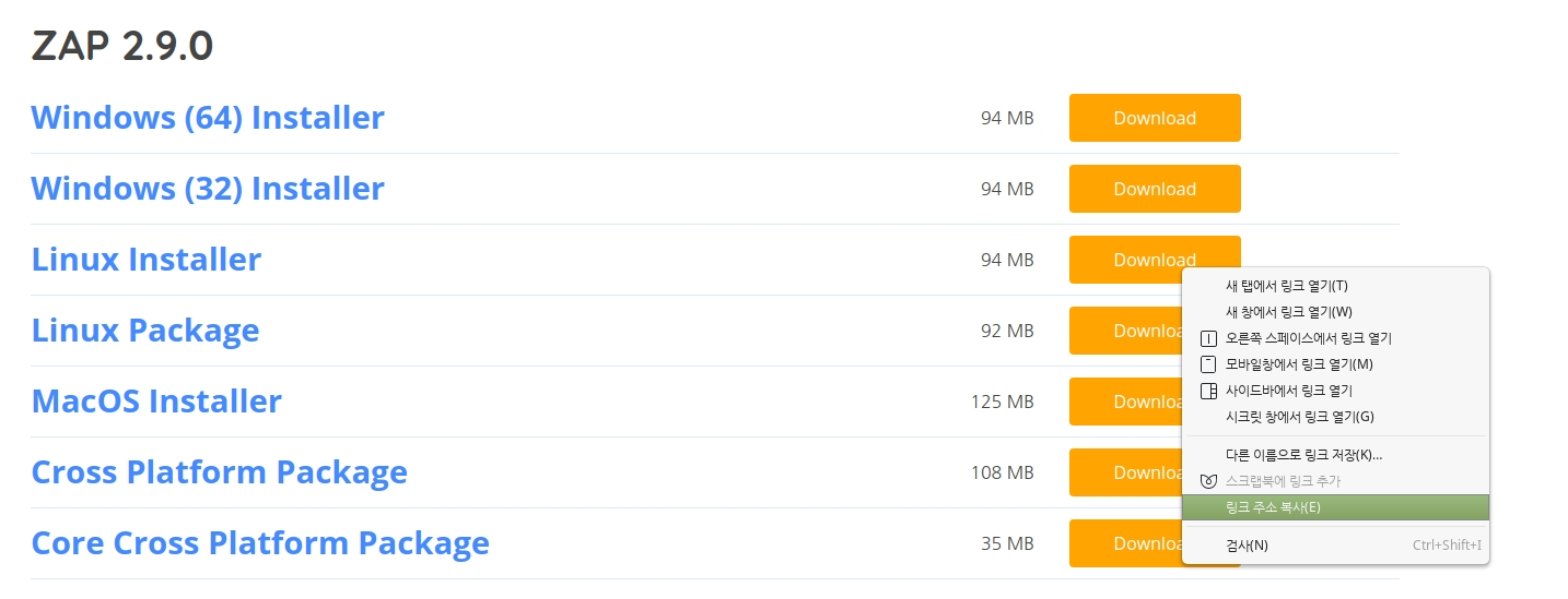 2. ZAP 설치파일 링크 복사(Installer or Package)