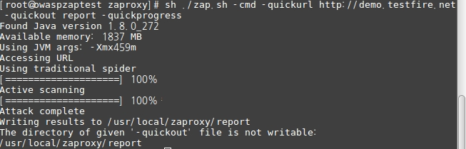 [root@owaspzaptest zaproxy]# sh ./zap.sh -cmd -quickurl http://demo.testfire.net -quickout report -quickprogress